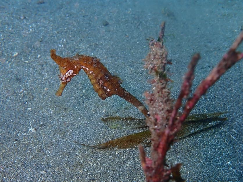 1本目はビーチで梶の浜。透明度が10mあってとてもキレイでした。目当ては定着しているTHEタツノオトシゴ!3匹とも見られました。